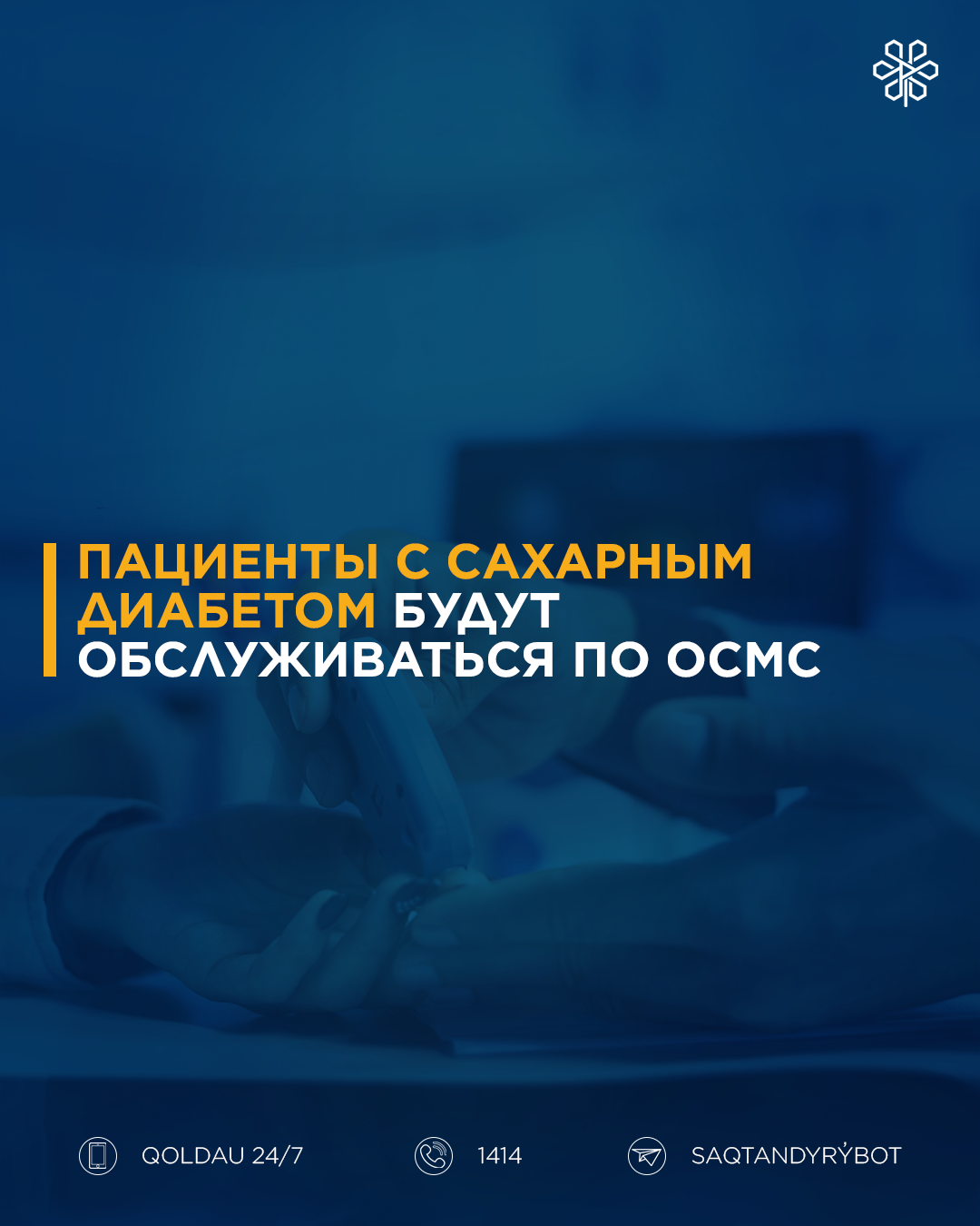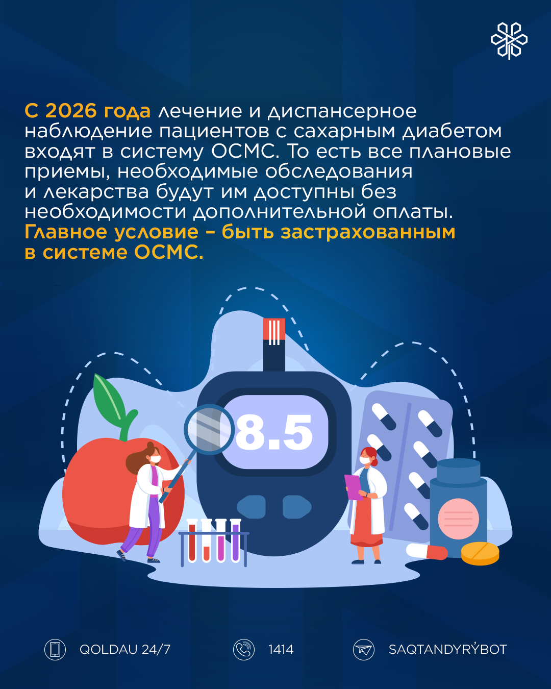 С учётом международной практики и в целях расширения доступа к терапии, финансирование лечения пациентов с сахарным диабетом переведено в пакет ОСМС. На сегодня сахарный диабет является управляемым заболеванием. Реализуются скрининги на диагностику сахарного диабета и его осложнений, программы амбулаторного лекарственного обеспечения, управления заболеваниями. Но при этом, значительная роль отводится самом пациенту в управлении собственным здоровьем.